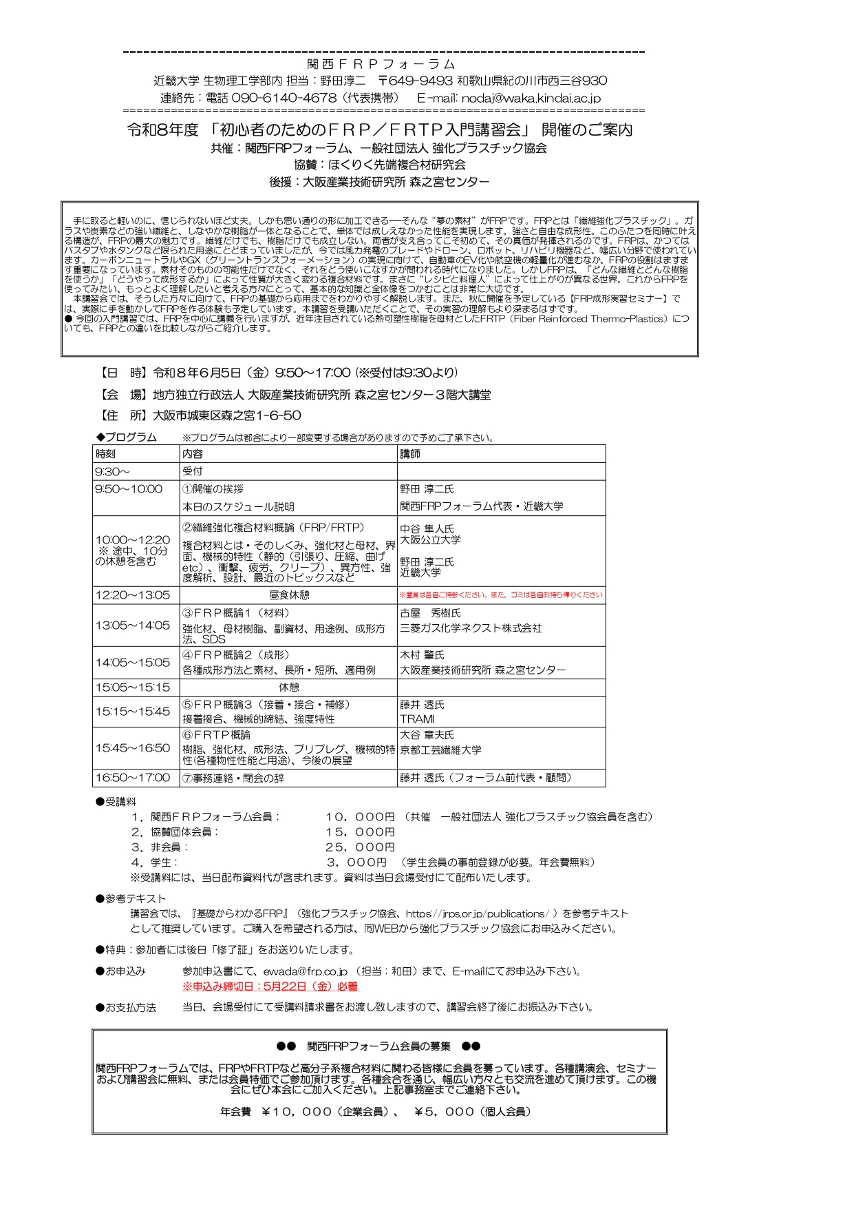what's new 【2026.6.5】関西FRPフォーラム 令和8年度「初心者のためのFRP/FRTP入門講習会」開催のご案内 ご案内のPDFは → こちら 申込書は → こちら ●お申込み:申込書に記入の上、関西FRPフォーラム事務局 (担当:和田様) ewada@frp.co.jp までメールにてお申込みください。 ※申込締切:令和8年5月22日(金)必着 参考資料「基礎からわかるFRP」 詳しくは → こちら 「基礎からわかるFRP」ご購入をご希望の方は、ご覧のHPの書籍注文ページよりご注文下さい → ご注文ページ