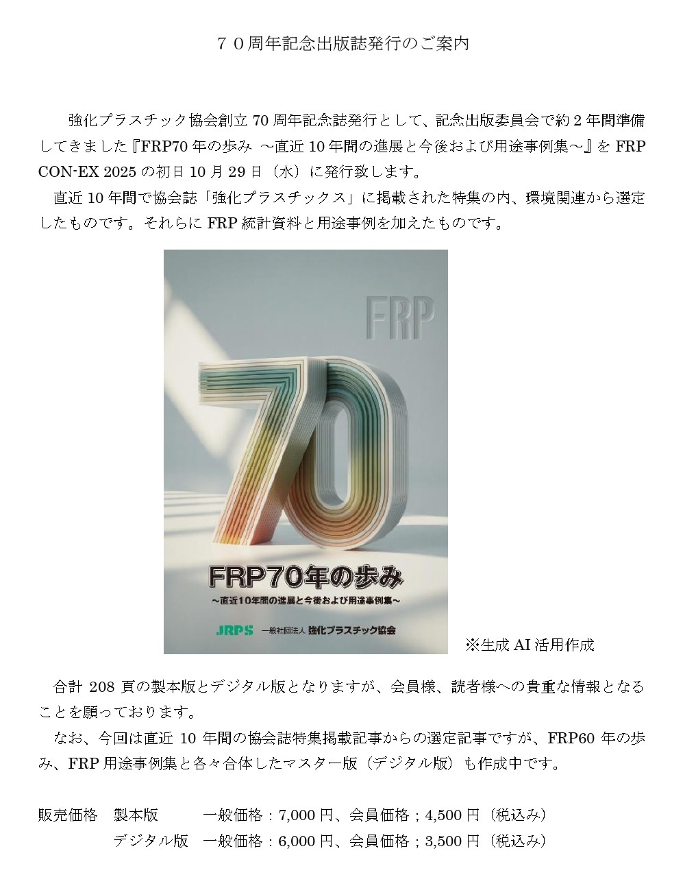 FRP70年の歩み ~直近10年間の進展と今後および用途事例集~(製本版、デジタル版) 協会創立70周年記念出版誌として、記念出版委員会で約2年間準備してきました『FRP70年の歩み ~直近10年間の進展と今後および用途事例集~』をFRP CON-EX 2025の初日10月29日(水)に発行致します。 直近10年間で協会誌「強化プラスチックス」に掲載された特集の内、環境関連中心の内容か...