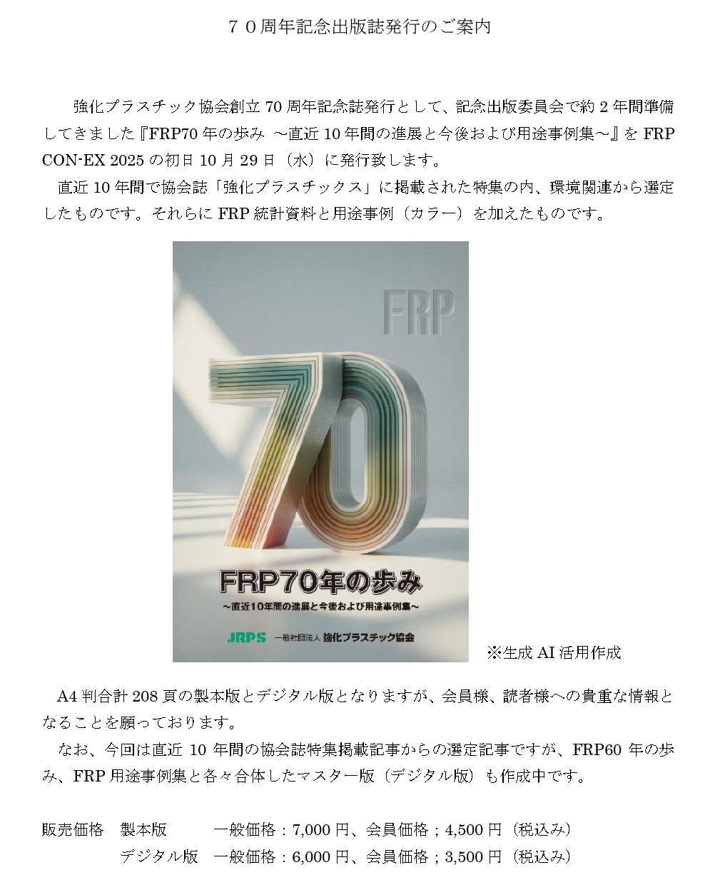 FRP70年の歩み ~直近10年間の進展と今後および用途事例集~(製本版、デジタル版) 協会創立70周年記念出版誌として、記念出版委員会で約2年間準備してきました『FRP70年の歩み ~直近10年間の進展と今後および用途事例集~』をFRP CON-EX 2025の初日10月29日(水)に発行致します。 直近10年間で協会誌「強化プラスチックス」に掲載された特集の内、環境関連中心の内容か...