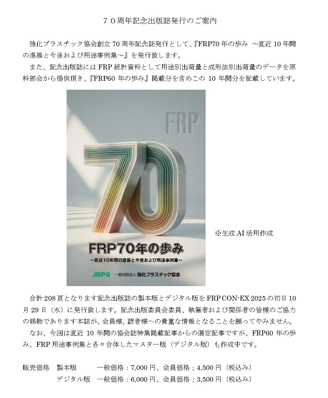 FRP70年の歩み ~直近10年間の進展と今後および用途事例集~(製本版、デジタル版) 協会創立70周年記念出版誌として、記念出版委員会で約2年間準備してきました『FRP70年の歩み ~直近10年間の進展と今後および用途事例集~』をFRP CON-EX 2025の初日10月29日(水)に発行致します。 直近10年間で協会誌「強化プラスチックス」に掲載された特集の内、環境関連中心の内容か...